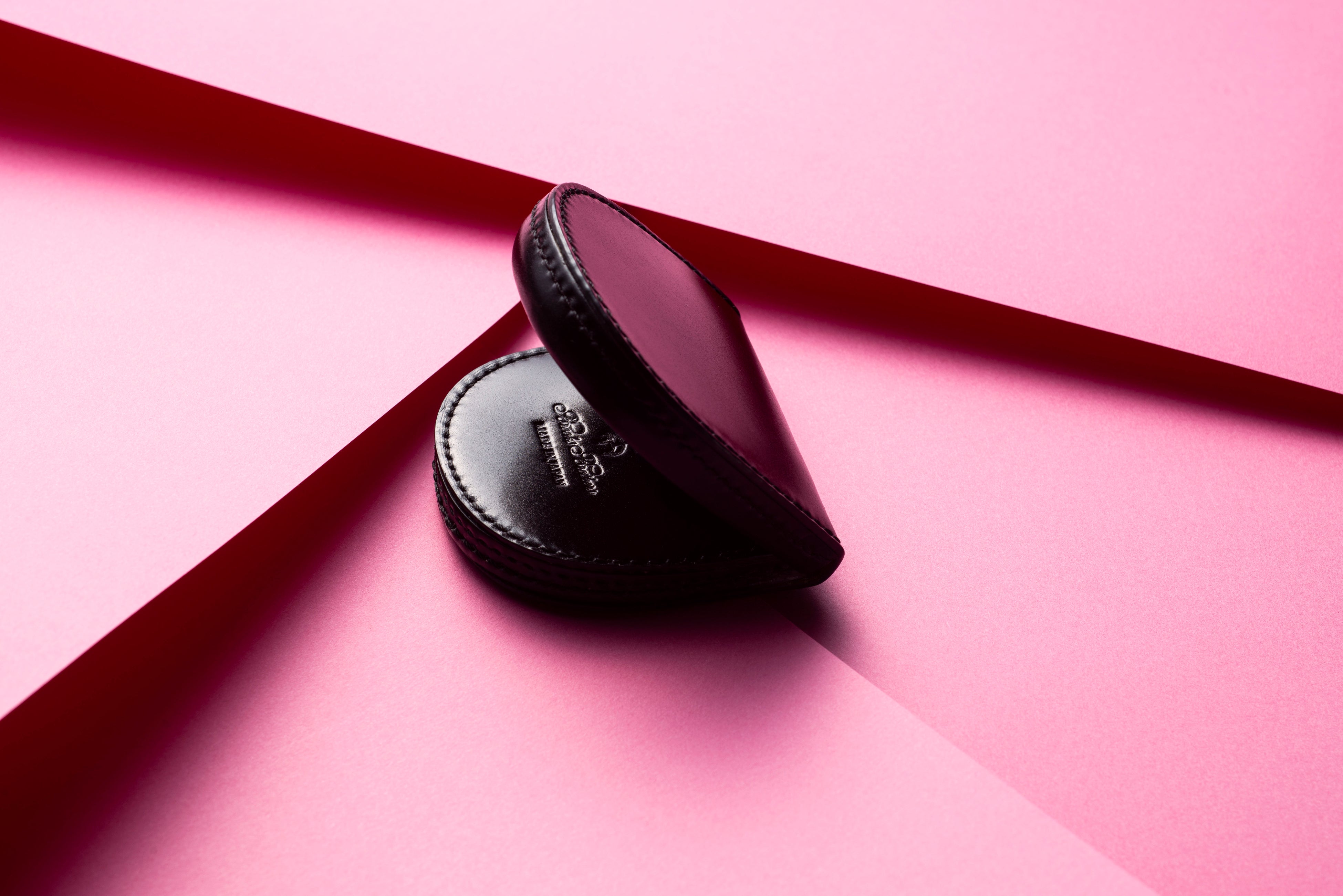 コードバン コインケース一頭の馬からごくわずかしか採れず、その透明感ある輝きから革の宝石とも称されるコードバン(馬革尻部)を使用しました。開くとトレーを兼ねた蓋側にコインをスライドさせることが出来るので見やすく、取り出しやすい設計です。フラップ付きの小さなフリーポケットには畳んだ紙幣や切手、印紙などを収納できます。欧米では古くから幸福のシンボルとされている馬蹄型で仕上げました。ボックス入りなのでプレゼントにもお薦めです。