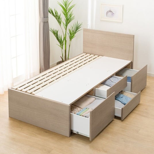 大小4つの引き出しに加え、すのこ床板下にも大容量の収納スペースを備え、日常使いの衣類からオフシーズン用品まで、用途別に効率よく収納できます。