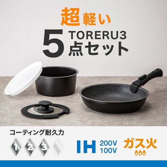 鍋・フライパン5点セットTORERU3 期間限定価格税込3,990円(1,000円お得)
