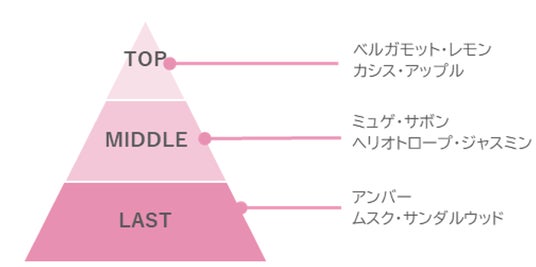 爽やかなベルガモットとレモンに、フルーティなアップルと柔らかで華やかなスイートミュゲを合わせた清潔感のある香り。