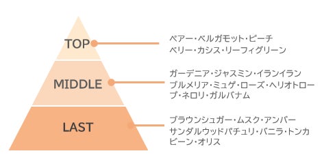上品なフローラルブーケを主体に、鮮やかですっきりとしたペアー、深みのあるブラウンシュガーの甘さを合わせることで重厚感のある魅惑の香りに仕上げました。