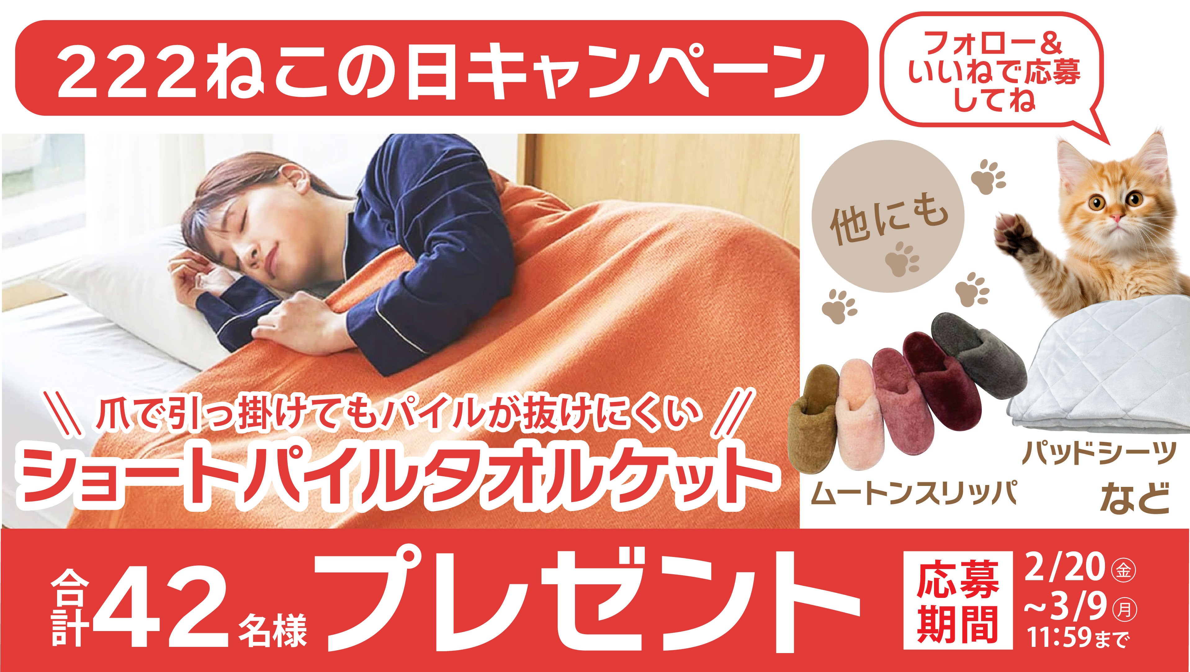 爪が引っかかりにくい「日本製ショートパイルタオルケット」を猫にちなんで22名に大盤振る舞い!