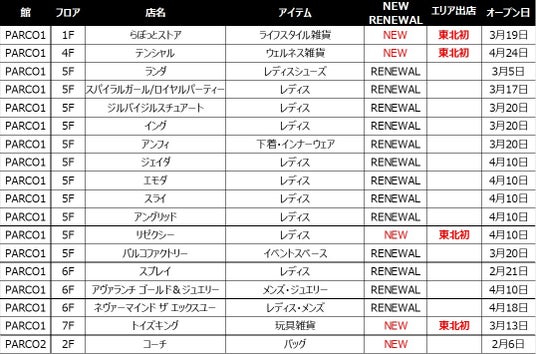 仙台PARCO 2026年春 NEW&RENEWALショップ一覧