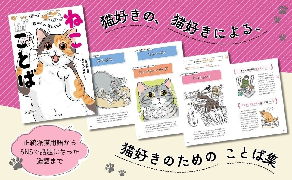 「ニャルソック」「お触りマップ」「ボニャール」など、猫好きの間で独自に生み出された言葉たち。SNSで共感を呼び、拡散されたことで、猫好き界隈で定着した言葉も少なくありません。本書では、そうしたSNSで話題になった言葉から、猫の体や行動に関する言葉まで99個を取り上げて紹介! 50音順で掲載しているので、気になる言葉から引き読みできます。