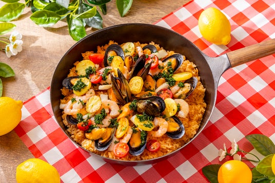 南イタリアの伝統料理。お米とジャガイモにムール貝やトマト、エビ、イカ、タコの旨みを重ねた、華やかな一皿。