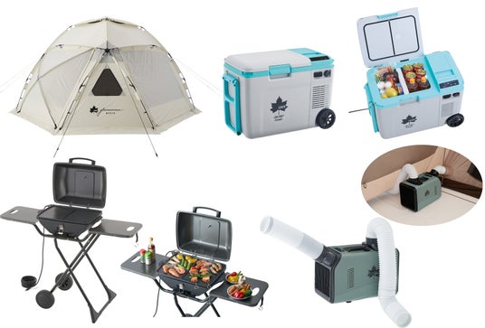 また、猛暑でもテント内を快適な温度に保つポータブル式のキャンピングエアコン「(野電)エレキャン・エアコン-BF」やコンセントに挿すだけで使用できる減煙仕様の電気式グリル「(野電)エレキャン・エレグリルPRO」、保冷・保温が同時使用できるホイール付きポータブル保冷保温庫「(野電)エレキャン・温冷/冷凍庫 27-BF(-20℃/60℃ ホイール)」など野外でも使用可能なAC100Vの電化製品「エレキャン」シリーズも特別価格でご用意しております。