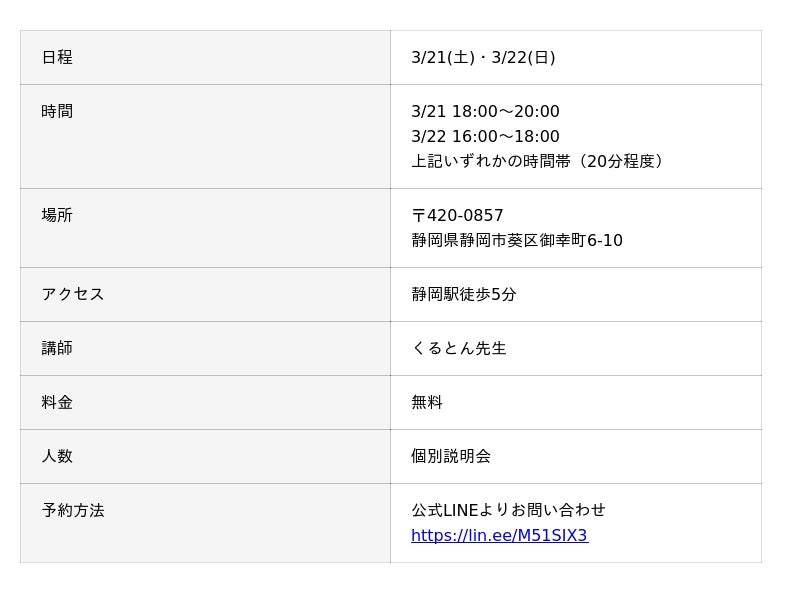占い師養成CAMPの説明会と同時に、くるとん先生の対面鑑定も静岡で行います。すでにご予約いただきました方、誠にありがとうございます。くるとん先生が静岡で鑑定される貴重な機会になりますので、奮ってご参加ください。