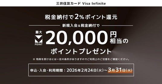 三井住友カード株式会社(本社:東京都江東区、代表取締役 社長執行役員 CEO:大西 幸彦、以下:三井住友カード)は、2026年2月24日(火)より「三井住友カード Visa Infinite」を対象とした2つの新規入会キャンペーンを開始します。本キャンペーンと、新規入会&利用特典を併せて条件達成いただくと、最大で17万円相当※ものポイントが進呈されます。この機会にぜひお申し込みください。