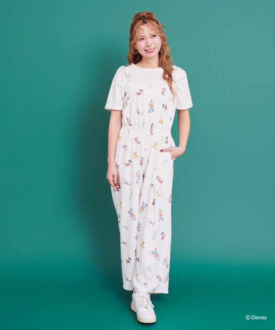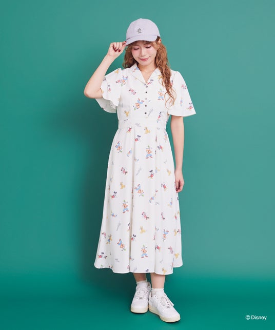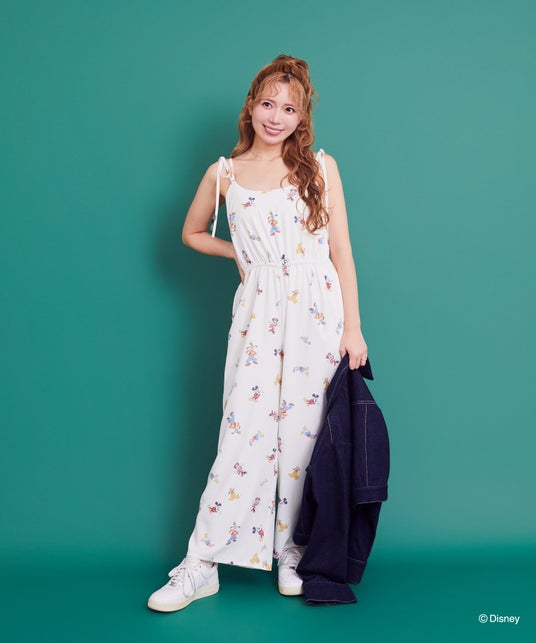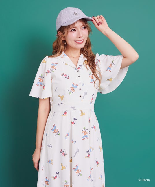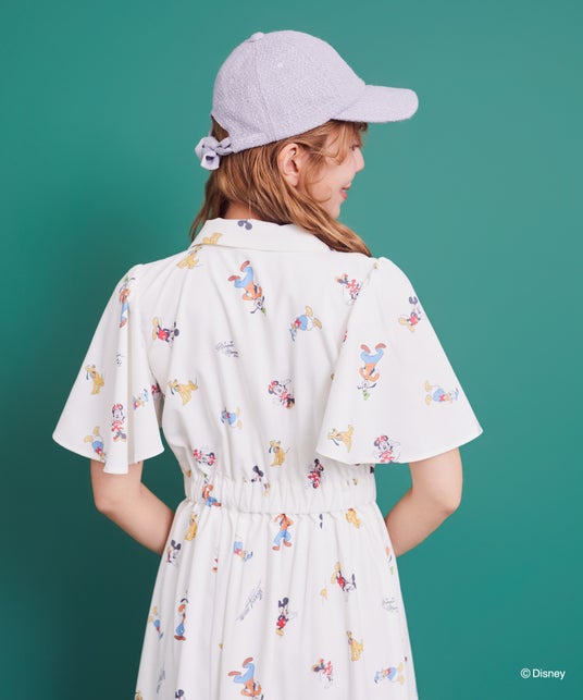 「ミッキー&フレンズ」をレトロなタッチで表現した、オリジナルの総柄アイテムは3型ラインアップ。チュニック風ブラウスと開襟デザインのワンピースは、腕や腰回りなど体型のお悩みをさりげなくカバーできるシルエットに仕上げました。開襟デザインのロンパースは、パンツならではの動きやすさがポイント。インナーや羽織との組み合わせ次第で、幅広いコーディネートをお楽しみいただけます。