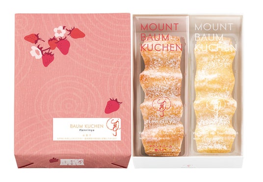 ねんりん家で春だけしか味わえない、苺の香り華やぐバームクーヘン。バターのコク広がる『マウントバーム』に、福岡県産「あまおう」の甘酸っぱい苺の味わいを加えて、じっくりと焼き上げました。ホワイトショコラを生地に練り込むことで引き立つ、苺のふくよかな美味しさをお楽しみください。
