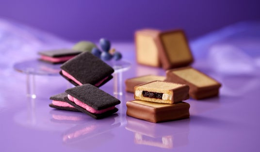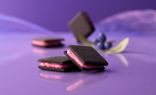 ▲ココアクッキーの黒色に、ハスカップクリームの鮮やかな紫色が目を引きます。