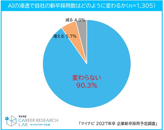 27年卒の採用予定数を増やす企業は23.0%で前年から減少。初任給引き上げを予定する企業は55.4%。9割以上の企業はAIが浸透しても新卒採用数は変わらない