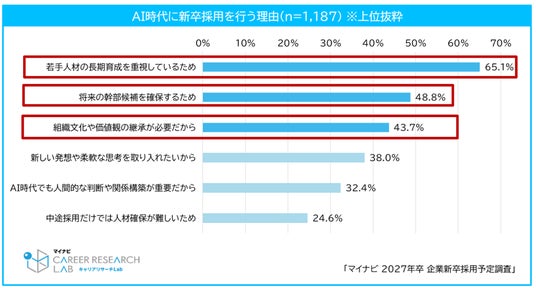 AIが浸透するなかで自社の新卒採用数はどのように変わるかを聞いたところ、「変わらない」が90.3%で最多だった。AI時代において、自社で新卒採用を行う理由を聞くと、最も多かったのは「若手人材の長期育成を重視しているため」(65.1%)で、「将来の幹部候補を確保するため」(48.8%)、「組織文化や価値観の継承が必要だから」(43.7%)と続いた。企業の持つ文化や価値観を継承するために、将来のコア人材となる社員の採用と、そうした人材の長期的な育成が必要だと考えている企業が多いようだ。またAI時代に新卒入社社員に求めるスキルや能力については「コミュニケーション力(AIを補完し、人との協働を円滑にする力)」(50.0%)が最も多く、対人的なコミュニケーションや関係構築に関するスキルを重視する企業が多いことがわかる。【図6、7、8】