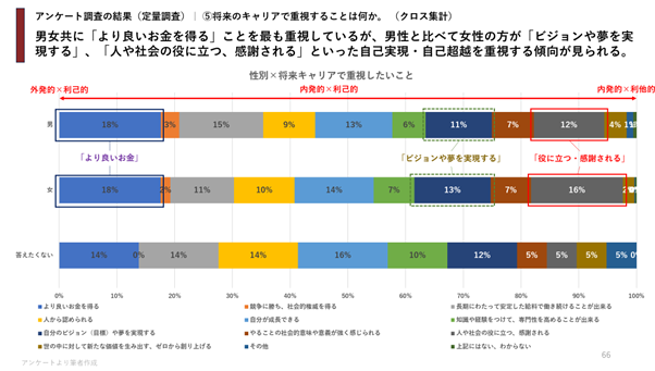 一方、アンケート調査では、生活のための「所得」や「雇用の安定」など外発的な価値観が最重要視されており、それらを前提として「自己成長」や「ビジョンや夢の実現」が重視される傾向が見られました。定量的には、外発的な価値観よりも内発的な価値観を重視しているとは言い切れない結果となっています。
