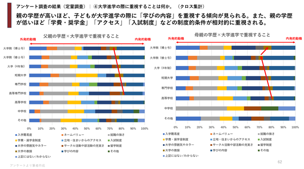 ● 親の学歴が高いほど、子どもが大学進学の際に「学びの内容」を重視し、親の学歴が低いほど「学費・奨学金」「アクセス」「入試制度」などの制度的条件が重視される