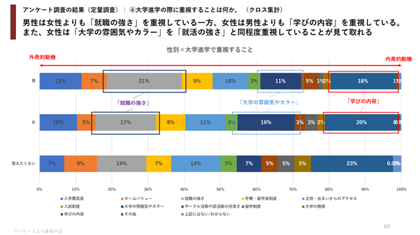 ● 大学進学において、男性は「就職の強さ」を重視する一方、女性は「学びの内容」や「大学の雰囲気やカラー」を重視している