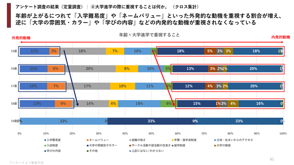 ● 年齢が上がるにつれて「入学難易度」や「ネームバリュー」といった外発的な動機を重視する割合が増え、逆に「大学の雰囲気・カラー」や「学びの内容」などの内発的な動機が重視されなくなっている