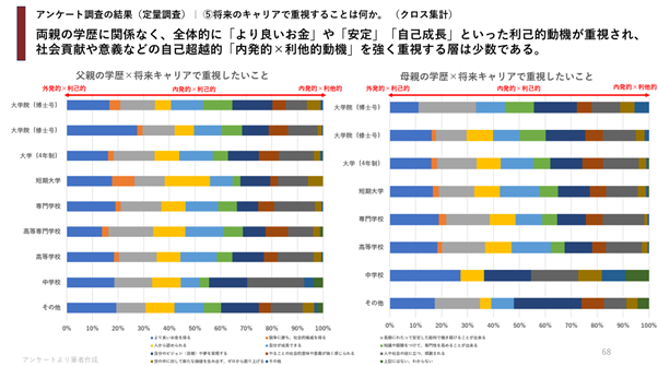 ● 親の学歴が高いほど、子どもが内発的動機を重視する傾向が見られるが、「お金」「安定」「自己成長」といった利己的動機は学歴に関係なく重視されている