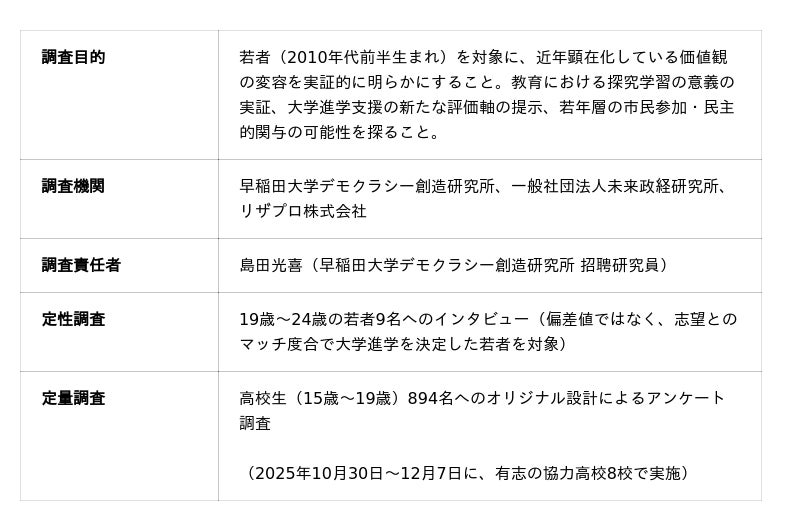 今回の調査は、2025年10月から12月に実施し高校生894名を対象としたアンケート調査(定量調査)と、19歳~24歳の若者9名を対象としたインタビュー調査(定性調査)を組み合わせた混合研究法によるもので、Z世代・α世代の価値観の変容を実証的に明らかにした研究成果です。