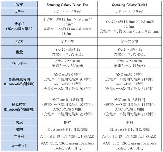 <主な仕様 : 「Samsung Galaxy Buds4 Pro」「Samsung Galaxy Buds4」>