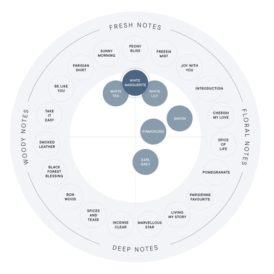「ホワイトマーガレット」はSHIRO FRAGRANCEの「ホワイトティー」と「ホワイトリリー」の中間のフレッシュさを持つ香りです。フレッシュなフルーツと透明感ある花々が織りなす、新しい春の香りを心ゆくまでお楽しみください。
