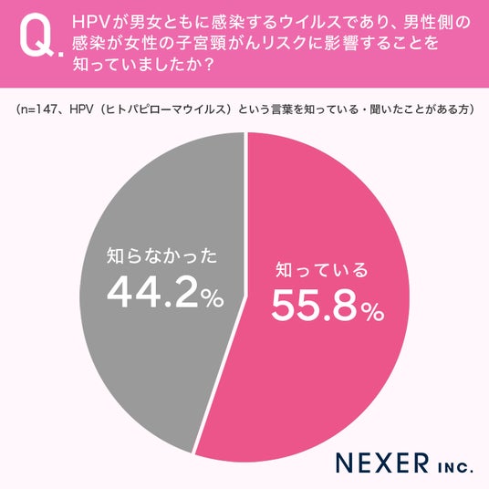 その結果「知っている」が55.8%、「知らなかった」が44.2%でした。HPVを知っている方の中でも、男性側の感染との関係までは把握していない方が半数近くいることがわかります。