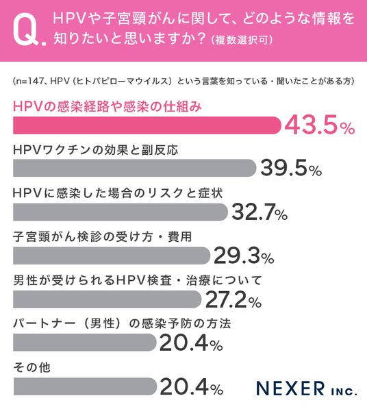 その結果、もっとも多かったのは「HPVの感染経路や感染の仕組み」で43.5%でした。次いで「HPVワクチンの効果と副反応」が39.5%、「HPVに感染した場合のリスクと症状」が32.7%と続きます。