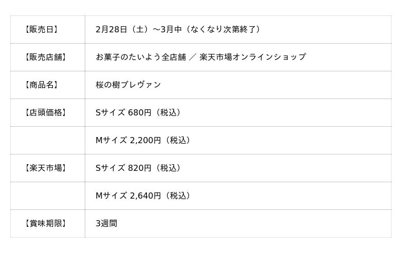 株式会社太陽社(所在地:千葉県匝瑳市飯倉293、代表取締役:片岡正裕)が展開する、千葉県で長年愛され続ける菓子店「お菓子のたいよう」は、桜スイーツ第3弾となる春限定のバウムクーヘン「桜の樹ブレヴァン」を、2月28日(土)より販売いたします。フランス・アルプスの名峰を冠した看板商品「ガトーブレヴァン」の季節限定バージョン。外はサクッと、中はもっちり。千葉県産米粉を使った独特の食感が楽しめる、春の桜風味満開の上品な焼き菓子です。