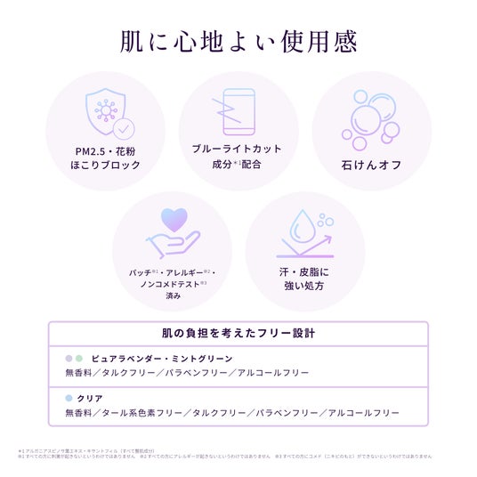 無香料・タルクフリー・パラベンフリー・アルコールフリーで肌に負担をかけづらいフリー処方。