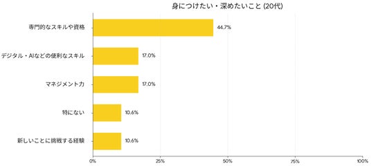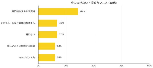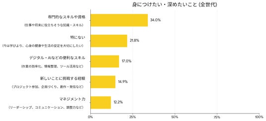 「女性活躍」という言葉に対し、全体の約4割(37.8%)が「正当なチャンスやポジションが増える」とポジティブな期待を寄せています。しかし注目すべきは、その「活躍」を誰かに用意してもらうのを待つのではなく、自らの手で掴み取ろうとする姿勢です。「少し時間や労力を使ってでも身につけたいこと」という問いに対し、全世代で最も多かった回答は「専門的なスキルや資格(34.0%)」でした。20代・30代ではその傾向がさらに顕著で、実に4割前後の女性がスキルの習得を熱望しています。