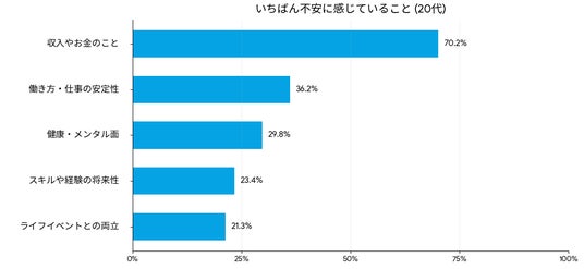 しかし、年代別に詳細を分析すると、40代を境に不安が変化する興味深い事実が浮かび上がりました。30代までは「収入やお金(経済)」が圧倒的な1位ですが、40代になると「健康・メンタル面(体力や気力が続くか)」への不安が急増し、「収入やお金」を上回り、不安の第1位となります。