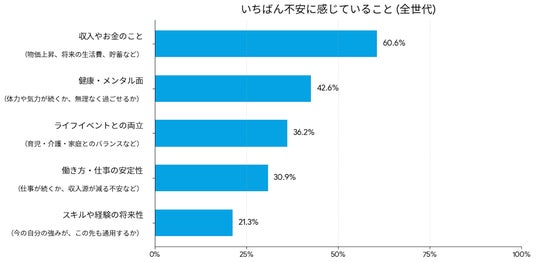 今回の調査で、全世代を通して最も多くの女性が抱いている不安は「収入やお金のこと(物価上昇、将来の生活費、貯蓄など)」であり、全体の60.6%に達しました。長引く物価高や不透明な社会情勢を背景に、将来の経済的基盤に対する危機感は共通の課題となっています。