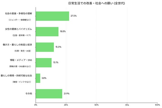 ・「生理・更年期」への社会的理解:生理用品の負担軽減や休暇の取りやすさ、更年期の不調を気兼ねなく相談できる環境など、「女性特有の体調変化」に対するアップデートされない社会認識に限界を感じている現状があります。