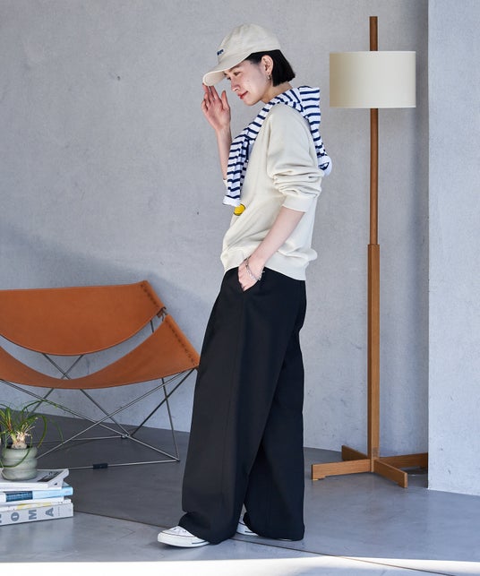 タックとセンタープレスを入れすっきりと綺麗な見た目ながら、ウエストゴム仕様で履き心地の良さも両立。細すぎず太すぎない程よいシルエットは汎用性が高く様々スタイリングに活躍します