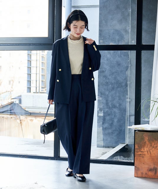 「きちんとした」印象を与えるネイビーのジャケットセットアップは、卒園式などのセレモニーシーンにもおすすめ。 ジャケットのインナーにはネイビーと馴染みが良く、顔映りを明るく見せるベージュをセレクト。 小物はブラックで統一し、落ち着きのあるフォーマルな印象に。