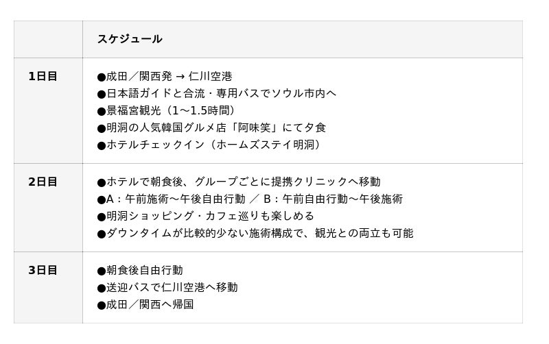 本ツアーは、初めての渡韓でも不安を感じさせない安心設計を重視し、観光と美容施術が両立できるパッケージです。先着30名限定で募集いたします。