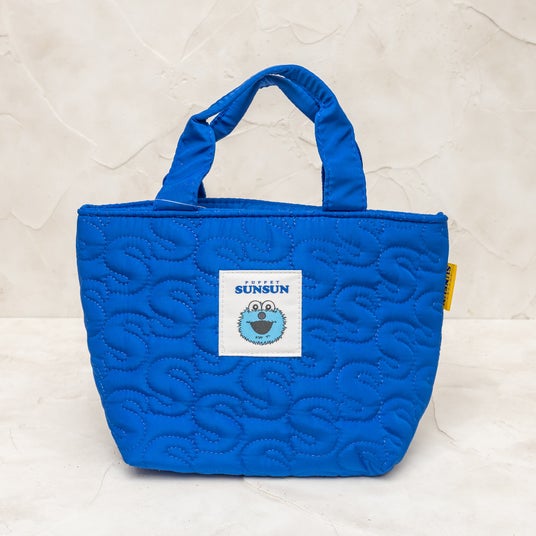 「キルティング生地ランチバッグ」は、鮮やかなブルーの生地に「S」の字のステッチを施し、中央に「スンスン」のワッペンをあしらったポップなデザインです。