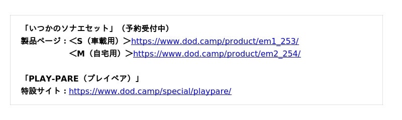 ビーズ株式会社(本社:大阪府東大阪市、代表取締役社長:大上響)が展開するアウトドアブランドの 「DOD」は、防災の新しい考え方「PLAY-PARE(プレイペア)」を提起いたします。この考えを具現化する新製品「いつかのソナエセット」2種(車載用・自宅用)と特設サイトを2026年2月27日(金)に公開しました。