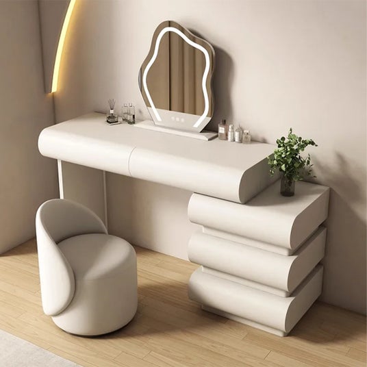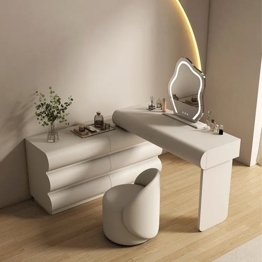 クラウド型LEDミラーを備えたドレッサー。調光可能な柔らかな光が日々のメイク時間を快適に演出します。天然木とPUレザーを組み合わせ、上質な質感と耐久性を両立。仕切り収納と大容量引き出しにより整理しやすく、限られた空間にも美しく収まる実用性とデザイン性を兼ね備えています。
