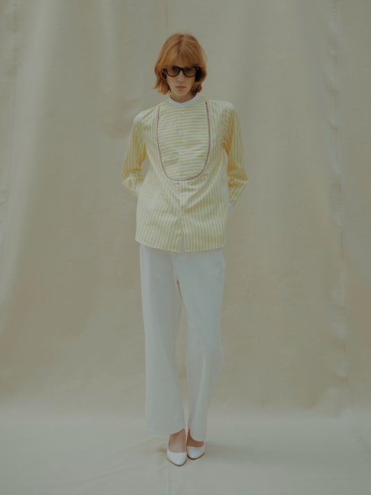 白のデニムにレモンイエローのストライプシャツと、ホワイトのパンプス。色はより軽やかに、白はより凛と映り、シンプルな組み合わせでありながらスイリングにさりげないニュアンスが加わります。色を纏う季節に、白が際立つ、この春のスタイリングを支える一本として、RH Vintage のホワイトデニムが新しいバランスをつくります。