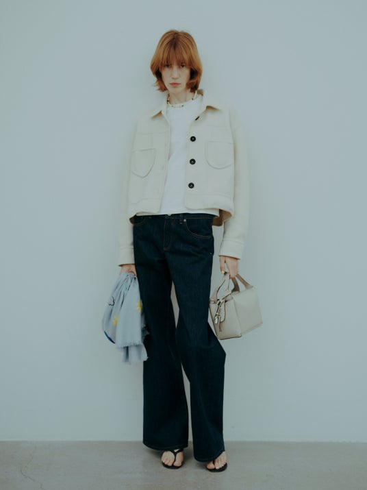白いデニムを軸に、色を重ねて。RH Vintageのホワイトデニムは、ハイライズのストレートレッグ。脚のラインを拾わず、まっすぐに落ちるシルエットと、とりわけ美しく見えるヒップラインが、クリーンな白に奥行きを与えます。ヴィンテージをルーツに持ちながら、どこかモダンで、女性の体をきれいに引き立てるバランスが、この一本の魅力です。