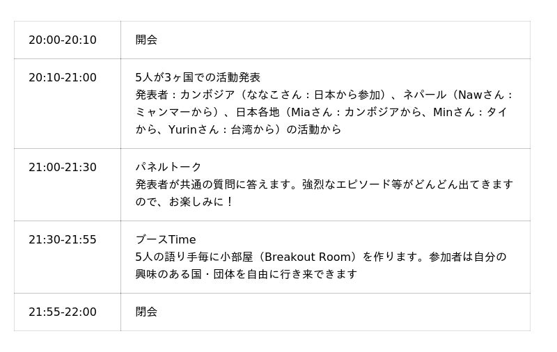 参加者は3月19日まで日本に滞在し、最終日に、彼女らが現場で流した数々の汗と涙のドラマを発表する場を創りました。オンラインでもつなぎますが、横浜会場では日本の各地で活動したカンボジア・タイの若者&カンボジアから帰国した日本の若者がおつまみも振る舞ってくれます。国際情勢が不安定さを増す今だからこそ、草の根レベルでの対話と協働の実践が持つ意味は小さくありません。小さな出会いと協働の積み重ねが、未来の関係性を形づくる――AVSは、その一つの実践です。