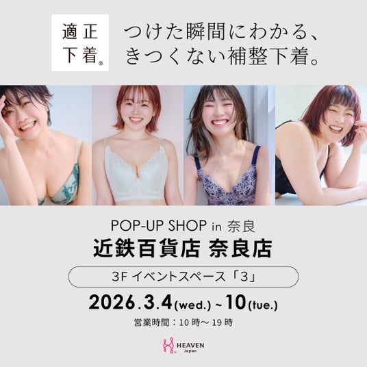 一人ひとりの女性の心と体に寄り添う「適正下着(R)」の開発から販売までを行う株式会社HEAVEN Japan(所在地:大阪府河内長野市、代表取締役:松田崇)は3月4日(水)~3月10日(火)の期間中、あ近鉄百貨店奈良店にて、適正下着のフィッティング体験ができるポップアップショップを開催いたします。