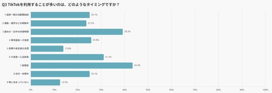 さらに、「帰宅直後~夕食前」は25.75%(111人)、「家事や身支度の合間」は13.92%(60人)と、日常のルーティンの中にもTikTokが入り込んでいる様子が見られます。