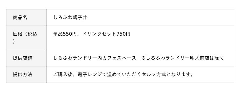 J&Jカンパニー株式会社(本店所在地:東京都渋谷区幡ヶ谷、代表取締役:大橋淳)が運営するコインランドリー事業「しろふわランドリー」は、都内で5店舗を展開する『カフェランドリー』として、メディアや雑誌でも紹介されるなど注目を集めています。このたび、併設するセルフ式カフェにて新商品「しろふわ親子丼」の提供を開始しました。