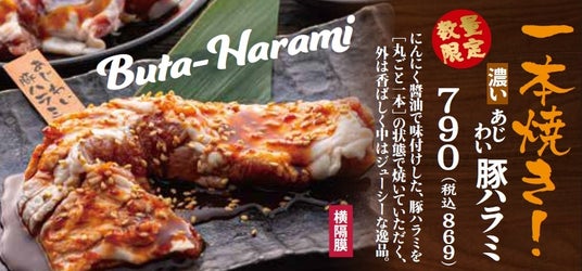 また、多くのお客様からのご要望にお応えし、丸ごと一本の状態で焼き上げる「豚ハラミ一本焼き」も登場します。にんにく醤油で味付けした豚ハラミを一本丸ごと豪快に焼き上げていただく、外は香ばしく中はジューシーな逸品です。