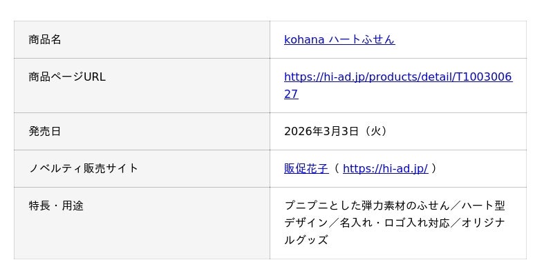 チャンスメーカー株式会社( https://www.ch-mk.jp/ )(代表取締役CEO:平林 満、本社:福井県坂井市)が運営するノベルティ専門サイト「販促花子( https://hi-ad.jp/ )」は、オリジナルブランド「kohana(R)」の「プニプニふせん」シリーズ新商品として、「 kohana ハートふせん( https://hi-ad.jp/products/detail/T100300627 )」を2026年3月3日(火)に発売いたします。