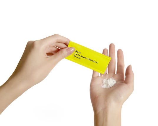 【週に1回】「アビブ ウィークリーハイパービタミンC(※3)プラスパウダー」を手のひらに置き、「アビブ デイリーハイパービタミンC(※3)セラム」を加え、指先で混ぜながら溶かします。