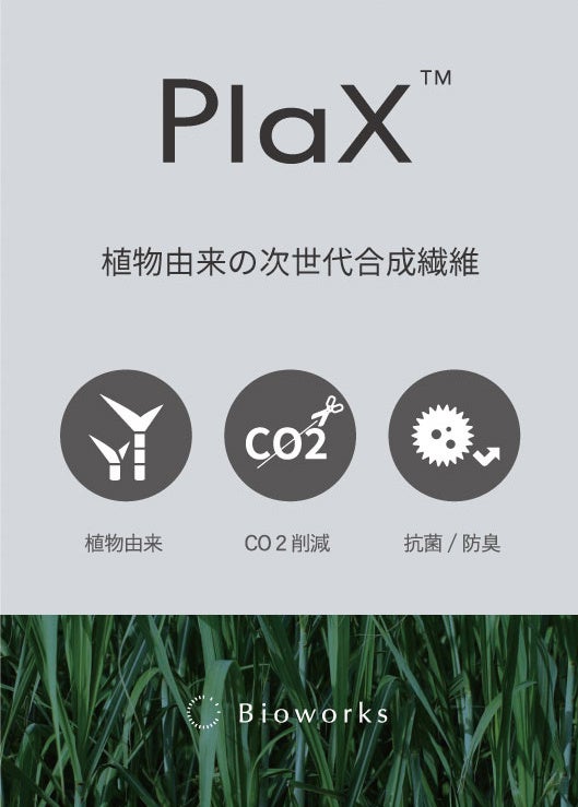 「PlaX(TM)(プラックス(TM))」は、サトウキビなどの植物を原料とするバイオマス素材「ポリ乳酸(PLA)」に、Bioworksの分子構成技術を活かした独自開発の植物由来添加剤を加えることで、品質と機能をアップデートさせた新素材です。