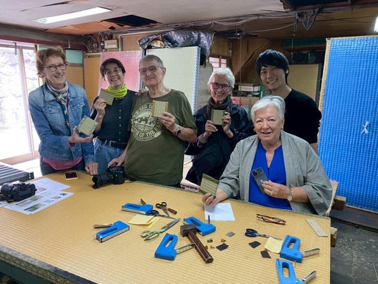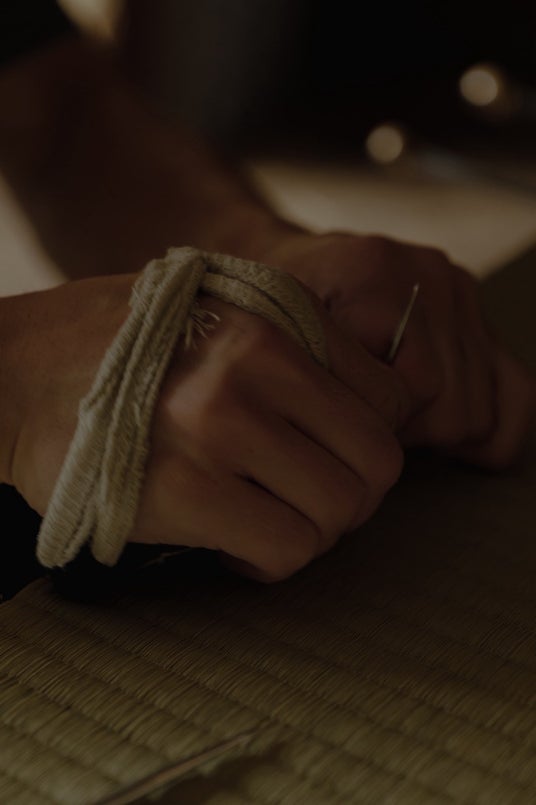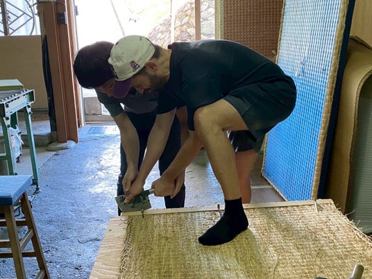 刀と同じ素材で作られた畳包丁を使って、畳の土台の切断から縁を手で縫い付けていく作業まで全ての工程を体験します。畳の土台は分厚く硬いので実は針を刺すだけでも難しいですが、畳の香りに包まれながら集中して作業する時間は日常の喧騒を忘れさせてくれます。